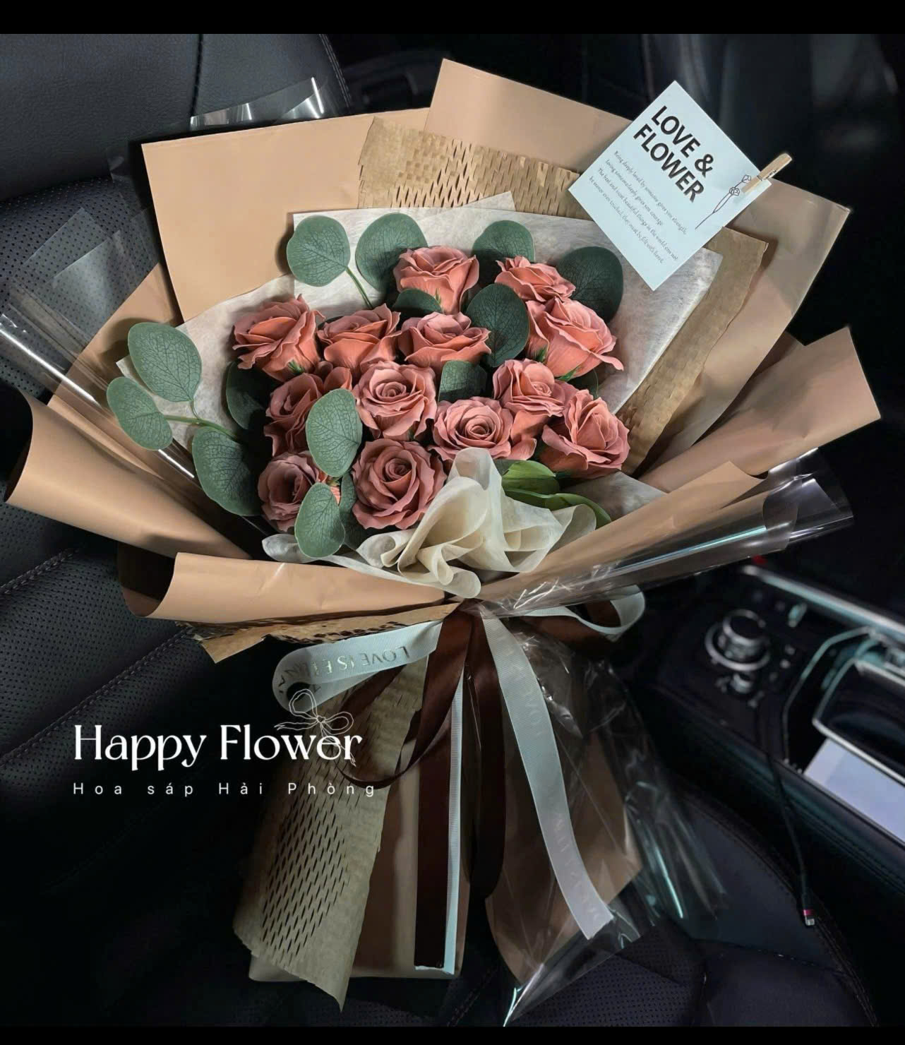 Bó hoa sáp tone nâu đất phối lá eucalyptus giả, gói bằng giấy kraft và lưới cao cấp mang phong cách châu Âu hiện đại. Thiết kế sang trọng, tinh tế, phù hợp cho cả nam và nữ. Hoa làm từ sáp cao cấp, mềm mịn, lưu hương lâu, bền màu 3–5 năm