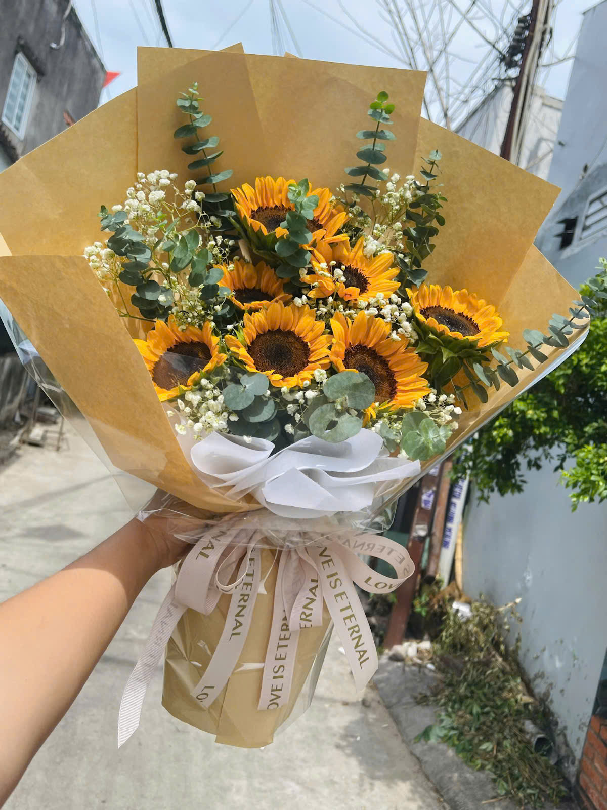 Bó hoa hướng dương giả cao cấp, được thiết kế tinh tế và sang trọng. Hoa hướng dương được làm từ chất liệu lụa mềm mại, màu sắc tươi sáng như thật, kết hợp cùng hoa baby trắng và lá bạc trang trí tạo nên tổng thể hài hòa, tự nhiên. Bó hoa được gói bằng giấy màu vàng nâu nhạt, điểm xuyết với nơ ruy băng trắng in chữ “LOVE IS ETERNAL”, mang ý nghĩa về tình yêu vĩnh cửu và niềm vui bền lâu. Với vẻ đẹp rực rỡ