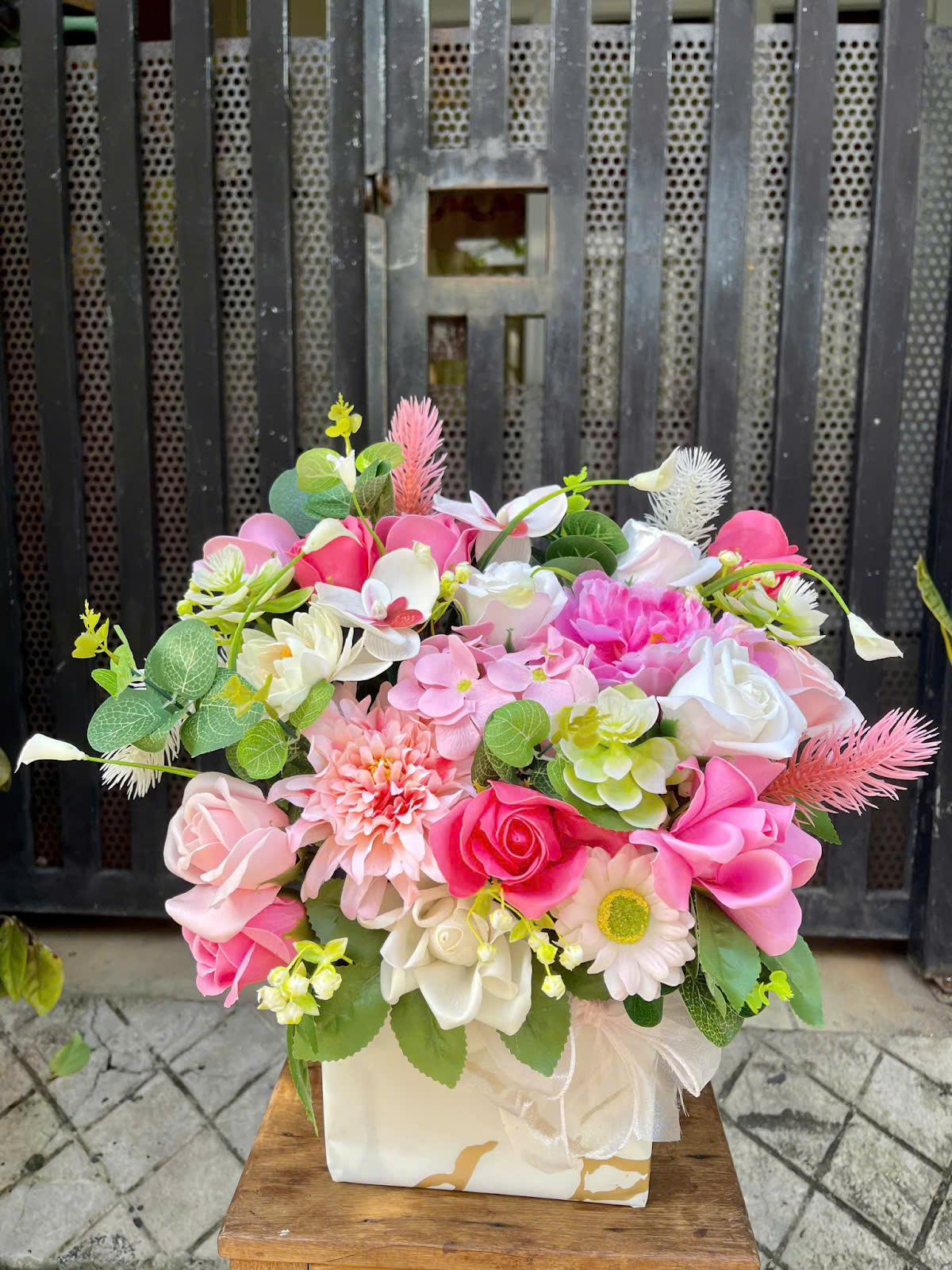 Trụ hoa được sắp xếp khéo léo với nhiều loài hoa khác nhau như hồng, mẫu đơn, cúc, lan, phối hợp hài hòa giữa các tông màu hồng, trắng và xanh lá. Từng cánh hoa mềm mại, tươi tắn, tạo nên tổng thể nhẹ nhàng và thanh thoát. Được đặt trong hộp vuông trang nhã, điểm thêm nơ trắng tinh tế, sản phẩm này không chỉ thích hợp làm quà tặng mà còn là món trang trí sang trọng cho không gian sống, mang lại cảm giác tươi mới và tràn đầy sức sống.